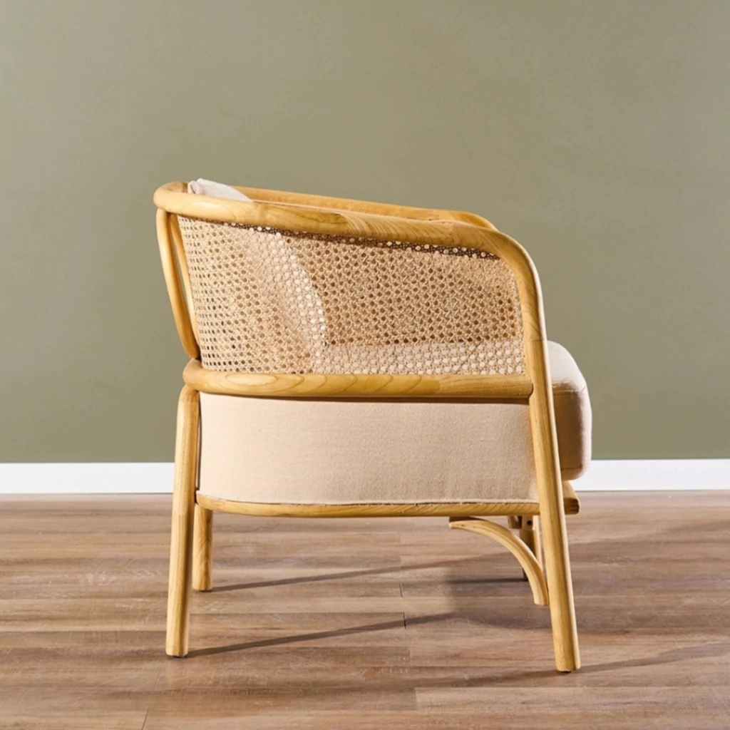 La Poltrona Fiji combina líneas curvas y materiales naturales para aportar calidez y elegancia a cualquier ambiente. Fabricada en madera de olmo de lustre claro y esterilla natural, es una pieza atemporal que fusiona lo artesanal con el diseño contemporáneo.
